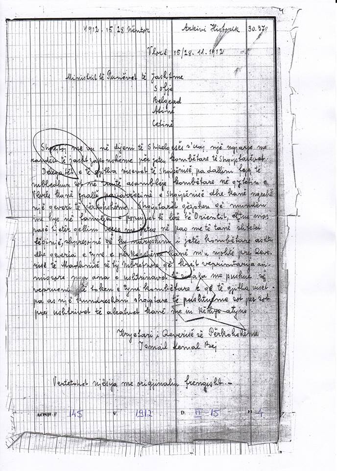 “… Shqiptarët gëzohen që mundën me hy në familjen e popujve të lirë të Orientit, dhe tue mos pasë tjetër qëllim veçse me jetue në paq me të tanë shtetet fqinje..”, shkruante Ismail Qemali në letrën drejtuar qeverive të Fuqive të Mëdha dhe të shteteve fqinje, menjëherë pas shpalljes së Pavarësisë më 28 Nëntor 1912, nga Kuvendi Kombëtar i Vlorës, ku i njoftoi “…për këtë ngjarje të jashtëzakonshme për jetën kombëtare të shqiptarëve..”.
