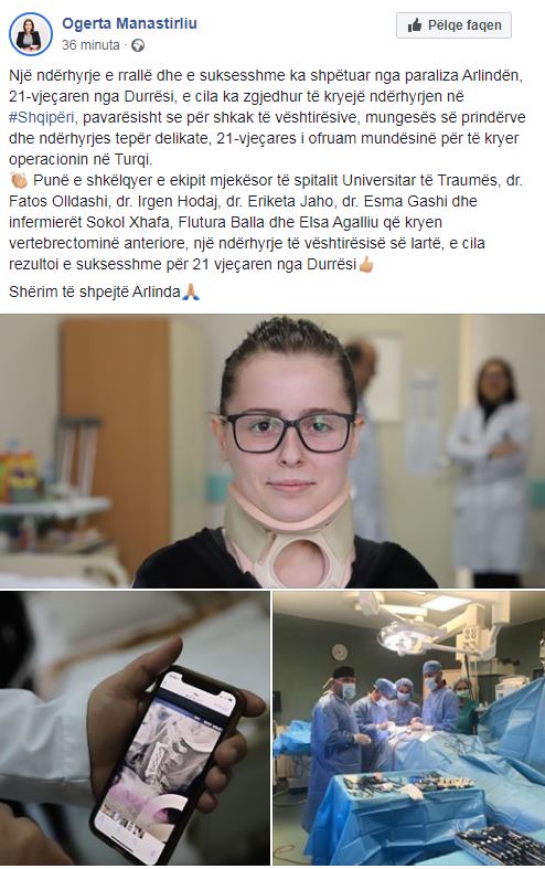 Ministrja e Shëndetësisë, Ogerta Manastirliu ka publikuar rastin e një 21- vjeçareje e cila zgjodhi të operohet në Shqipëri dhe në fund shpëtoi nga paraliza.