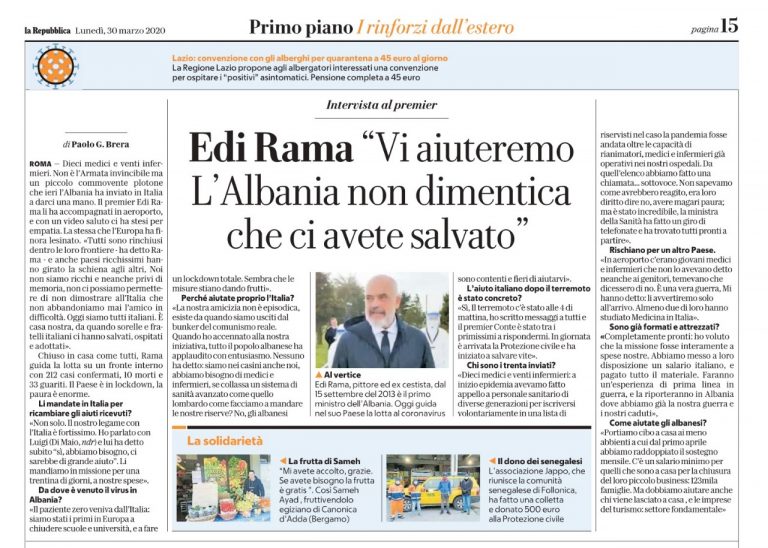 Jo vetëm kjo. Lidhja jonë me Italinë është shumë e fortë. Fola me Luigin (Di Maio) dhe ai më tha menjëherë “po, kemi nevojë, do të na ndihmonit shumë”. Po i dërgojmë në mision për tridhjetë ditë, me shpenzimet tona.