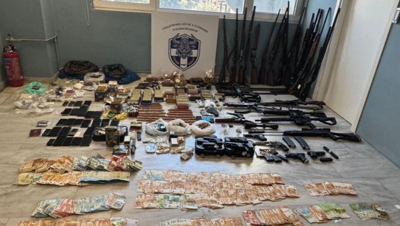 Pamjet e publikuara nga policia tregojnë një arsenal të plotë armësh, përfshirë pushkë gjysmë-automatike, armë lufte dhe pistoleta, si dhe sasi të mëdha municionesh, celularë, para në kartëmonedha euro dhe paketime me lëndë narkotike. Sipas vlerësimeve të policisë greke, të ardhurat totale të organizatës kriminale arrinin në rreth 3 milionë euro.