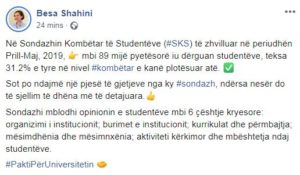 Ministrja e Arsimit Besa Shahni ka publikuar një pyetësor të zhvilluar tek studentët mbi institucionet arsimore.