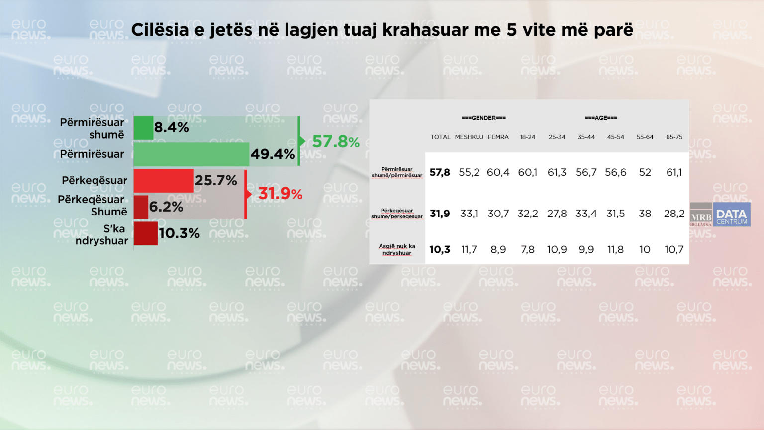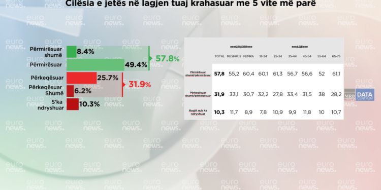 Sa i përket jetesës në zonën ku banojnë krahasuar me 5 vite më parë, 57.8 % e kryeqytetasve mendojnë që gjërat kanë shkuar më mirë. 31. 9 % e tyre mendojnë që gjërat po shkojnë më keq ndërsa 10.3 % e tyre mendojnë që gjërat nuk kanë ndryshuar.