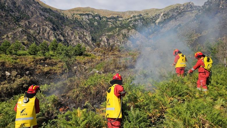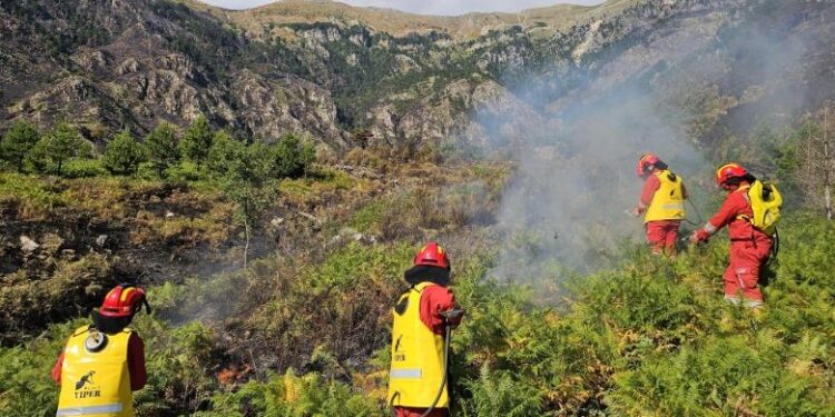 Në fshatin Dishnicë, bashkia Korçë vijon puna për shuarjen e zjarrit në një sipërfaqe me shkurre.