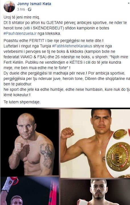 Luftetari i ringut nga Turqia #FatihMehmetKarakus shtyre nga vetebesimi i pervojes se tij ne boks & kikboks (kampion bote ne federatat WAKO & FSA) dhe 26 ndeshje ne boks, u shpreh: “Njoh mire Ferit Ketén. Publiku ne vendlindjen e KÉTES i cili do të jete kundra meje, me ben mua edhe me te forte” !