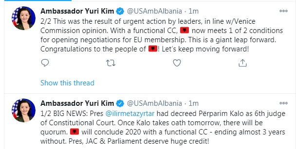 Shqipëria do të përmbyllë vitin 2020 me një Gjykatë Kushtetuese funksionale, duke përfunduar periudha gati 3 vjeçare e mungesës së saj”- shkruan midis të tjerash ambasadorja amerikane.