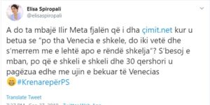 “A do ta mbajë Ilir Meta fjalën që i dha http://çimit.net kur u betua se “po tha Venecia e shkele, do iki vetë dhe s’merrem me e lehtë apo e rëndë shkelja”? S’besoj e mban, po që e shkeli e shkeli dhe 30 qershori u pagëzua edhe me ujin e bekuar të Venecias #KrenarepërPS”, shkruan Spiropali. /l.m