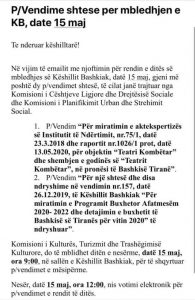 Këshilli bashkiak do të mblidhet nesër për të votuar mbi propozimin për shembjen e godinës së Teatrit Kombëtar. Mbledhja është parashikuar të nisë në orën 12:00.