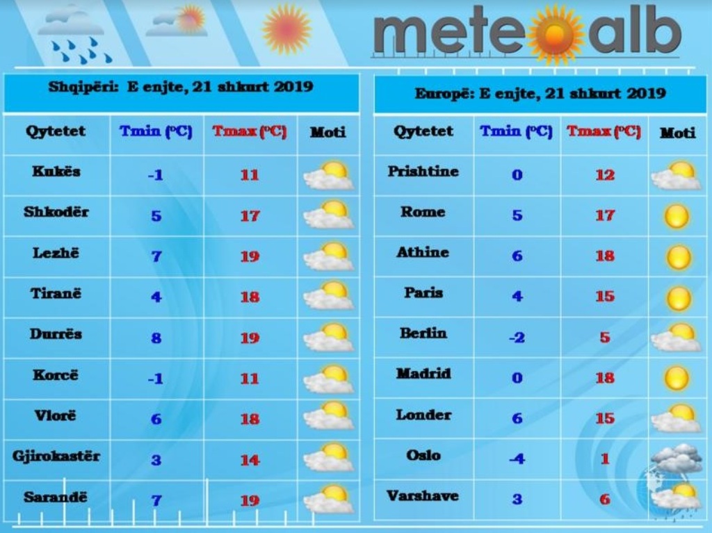Sipas MeteoAlb, temperaturat e ajrit do të rritennë mëngjes por rritje të lehtë sjell dhe mesdita duke variuar nga -3°C deri në 19°C, maksimumi në zonat perëndimore.