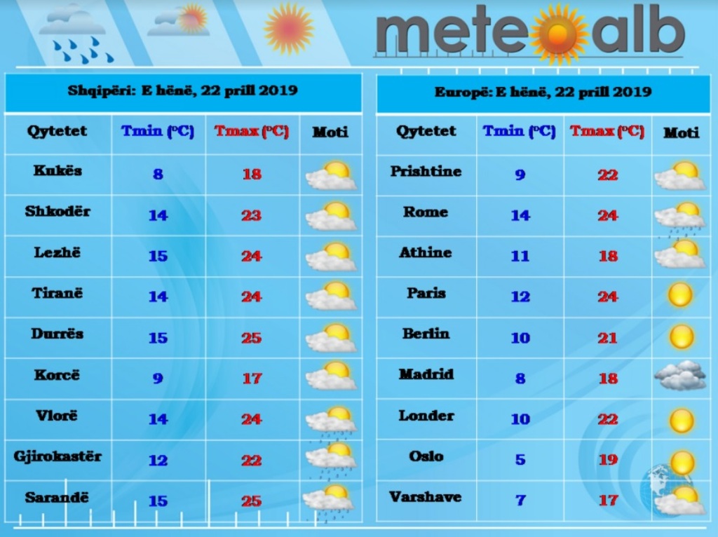 Sipas MeteoAlb, temperaturat e ajrit do të rriten lehtë në vlerat e mëngjesit por dhe në mesditë duke bërë që vlerat ditore të luhaten nga 7°C deri në 25°C.