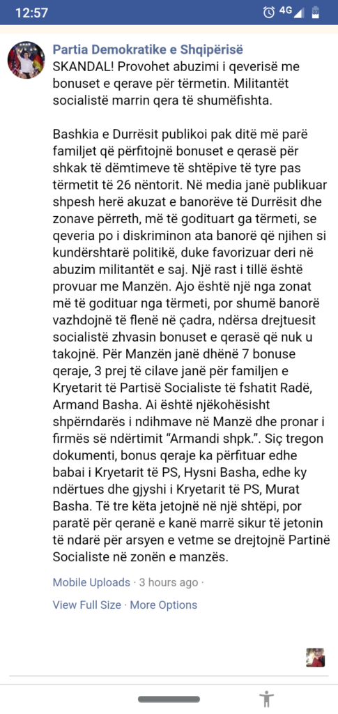 “Të nderuar miq dhe të njohur, sic jemi në dijeni, me dt.26 Nëntor 2019, më së shumti Qarku i Durrësit, u prek nga një tërmet i fuqishëm, me pasoja tragjike dhe viktima. Për fat të mirë, unë dhe familjarët e mi, shpëtuam shëndoshë e mirë, por praktikisht banesa ime private në fshatin Radë, Manëz (Durrës), ku unë dhe familjaret e mi jetojmë, u dëmtua rëndë dhe është e pabanueshme, vërtetuar kjo dhe nga akt- konstatimi i banesës, firmosur nga ekipi i specialistëve të ardhur nga Turqia.