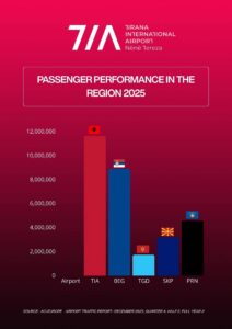 “Sipas statistikave të publikuara nga Këshilli Ndërkombëtar i Aeroporteve, Aeroporti Ndërkombëtar i Tiranës – TIA, përpunoi 11.6 milionë pasagjerë në vitin 2025, duke shënuar një rritje prej 8.7% krahasuar me vitin 2024 dhe duke u renditur i pari në rajon. Gjatë vitit 2025 u shtuan 15 destinacione të reja dhe 7 linja ajrore partnere”, shkroi Rama në Facebook.