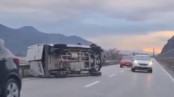 Një furgon ka devijuar nga rruga dhe është përmbysur në anë të saj.