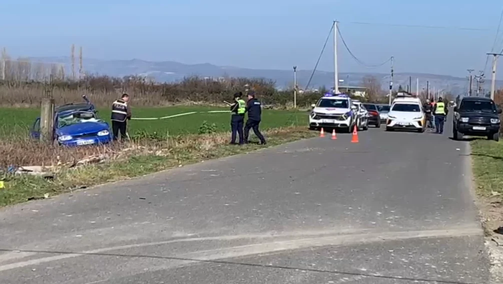 Si pasojë e përplasjes së fortë, njëra prej makinave ka përfunduar në anë të rrugës.