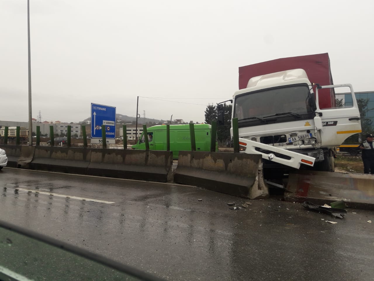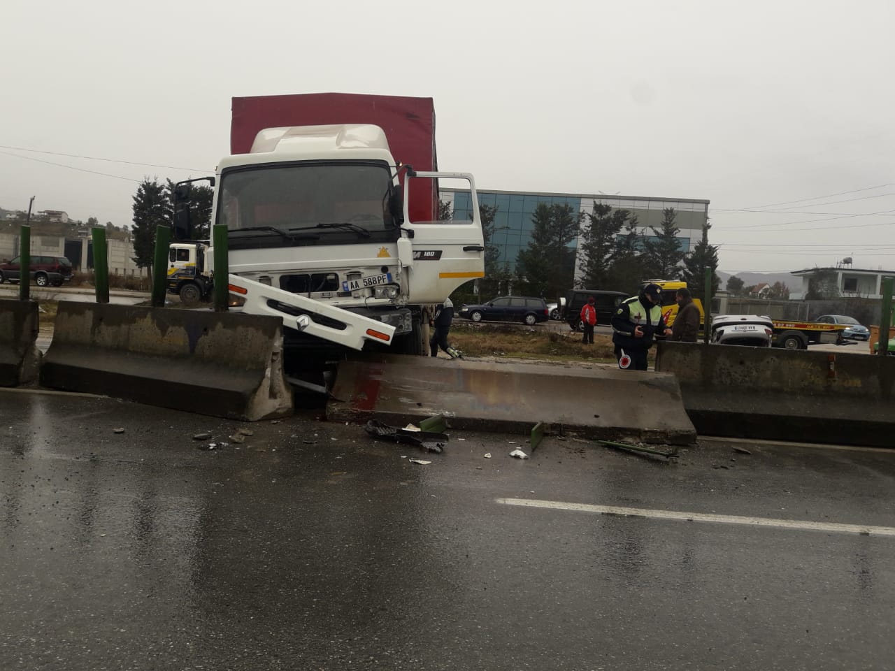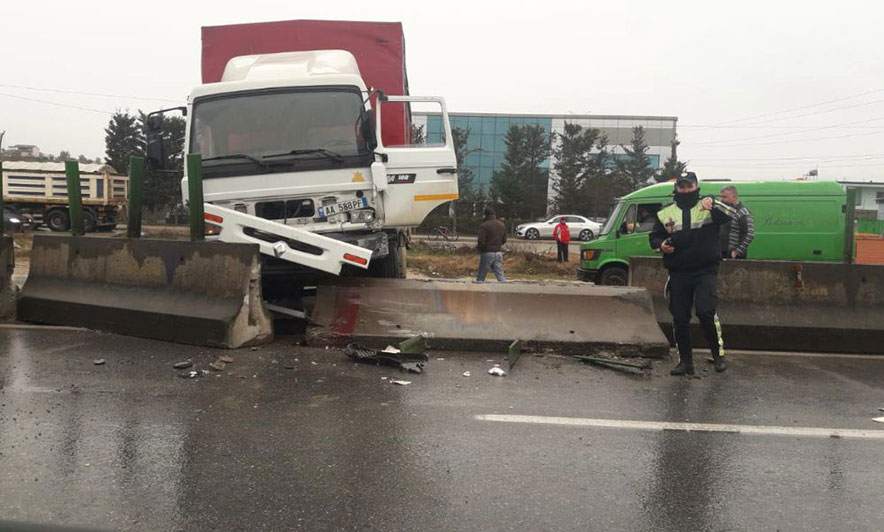 Një mjet i tonazhit të rëndë ka humbur kontrollin si pasojë e lagështirës në rrugë, duke u përplasur me barrierën ndarëse të rrugës.