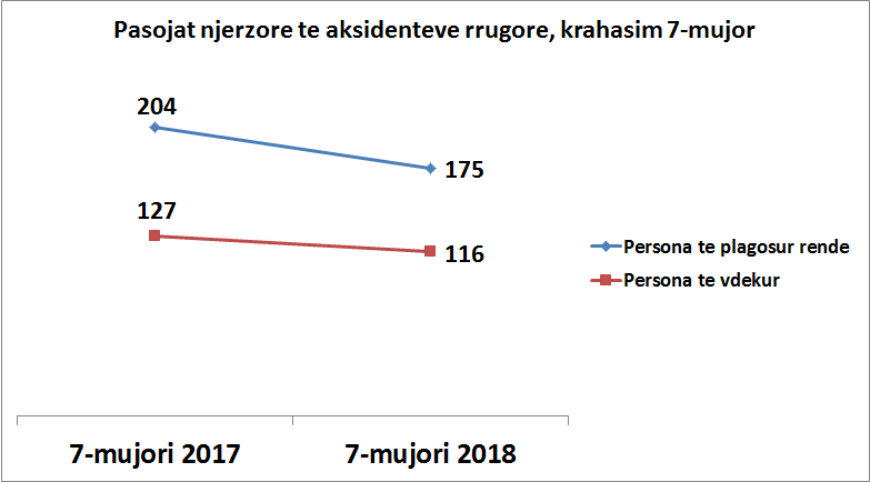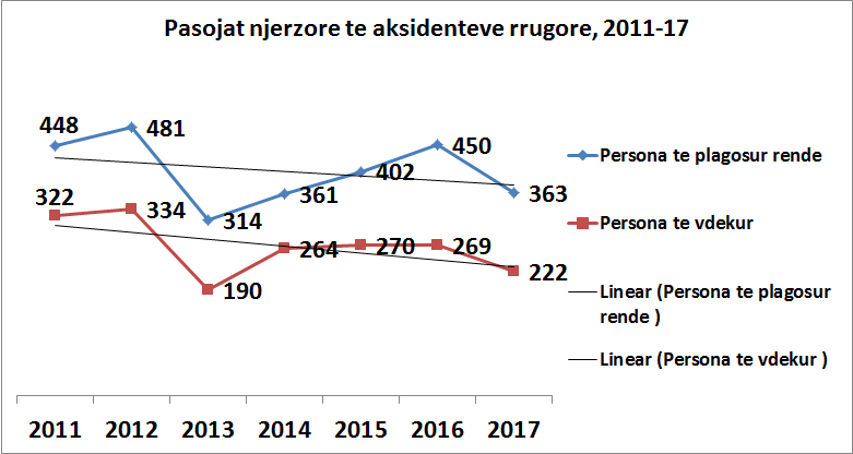 Megjithëse në dekadën e dytë të këtij shekulli është rritur ndjeshëm numri i automjeteve që qarkullojnë në Shqipëri (si pasojë edhe e vizitorëve që vijnë me automjete nga vendet përrerth e përtej), numri i i të vdekurve dhe të plagosurve rëndë nga aksidentet rrugore ka njohur një trend linear ulës (shihni grafikun 1). Kështu, në vitin 2011, vdiqën nga aksidentet rrugore 322 persona, ndërsa vjet vdiqën 100 persona më pak. Në vitin 2011, u plagosën rëndë 448 persona, ndërsa vjet 85 më pak. Dhe trendi ulës ka vazhduar edhe në 7-mujorin e parë të këtij viti (shihni grafikun 2).