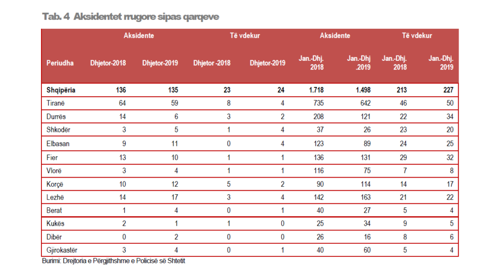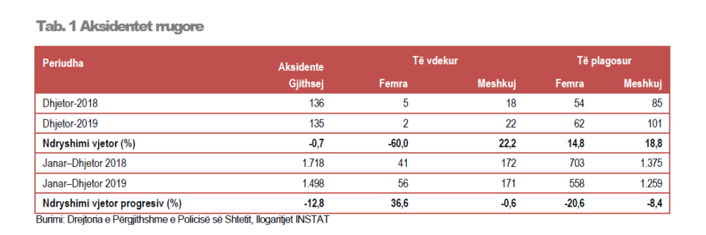 Në muajin Dhjetor 2019, numri i të aksidentuarve, të vrarë dhe të plagosur është 187 persona nga 162 që ishte një vit më parë, duke u rritur me 15,4 %.
