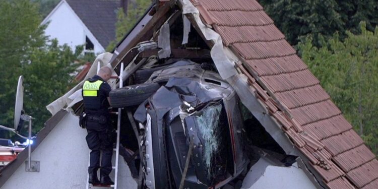 Një aksident i pazakontë dhe i rëndë ka ndodhur të dielën në qytetin Bohmte në Gjermaninë veriperëndimore, ku një makinë ka dalë nga rruga duke përfunduar mbi çatinë e një hambari rreth 3 metra lartësi.