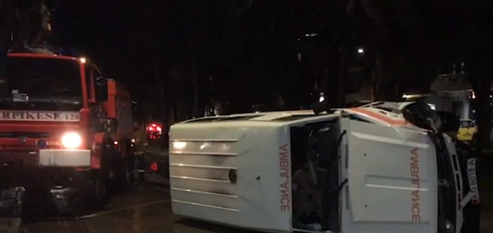 Një ambulance është përmbysur në një prej rrugëve kryesore te qytetit.