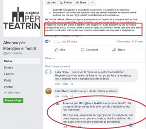 Një fakt i tillë pranohet edhe nga vetë aktivistët për Mbrojtjen e Teatrit, të cilët në deklaratën e lëshuar për mediat shprehen se “Ambasadori ishte mjaft mikpritës dhe takimi u karakterizua nga një debat i fortë e mjaft etik, por, megjithë përpjekjen e vazhdueshme për një qëndrim të përbashkët, të dy palët kanë pikëpamje të ndryshme në lidhje me problemin Teatrit, por edhe të zhvillimeve politike në vend që kanë frymëzuar çështjen e Teatrit.”