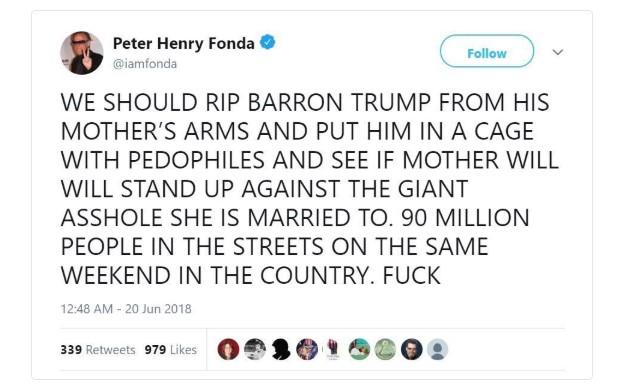 “Duhet t’ia heqin nga krahët e nënës Barron Trump dhe më pas ta mbyllin në një kafaz me podifilët”. Këtë ka shkruar në Twitter aktori i njohur Peter Fonda në lidhje me djalin 11-vjecar të presidentit të SHBA-së.