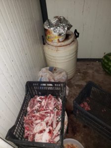 Subjekti “Jeton Hida” me aktivitet “Kamping” Sotirë, Korçë, i inspektuar në kushtet e flagrancës, ushtronte aktivitetin në kushte të papërshtatshme higjeno-sanitare në kuzhinë dhe në dhomat frigoriferike, mungonte sistemi i gjurmueshmërisë (21 kg Salcë) dhe produkte “mish” pa vulë dhe pa certifikatë veterinare (20 kg mish qingji, 34 kg mish lope, 38 kg mish derri dhe 34 kg të brendshme lope). Për shkeljet e konstatuara, trupa inspektuese mori masat administrative të mëposhtme: