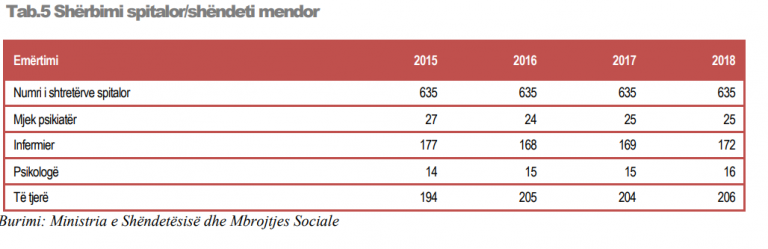 Sipas të dhënave nga INSTAT të publikuara në Treguesit e Shëndetit Publik, numri i shtretërve në shërbimin spitalor të specializuar për shëndetin mendor është 635. Ndërkohë në këtë shërbim spitalor të specializuar operojnë 25 mjek psikiatër.