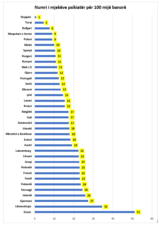 Sëmundjet e shëndetit mendor po njohin përhapje më të madhe në popullatë së fundit. Por për të përballuar të sëmurët e prekur kërkohen kapacitete si burime njerëzore të specializuar dhe numër shtretërish. Shqipëria për fat të keq renditet e fundit në Europë për nga numri i mjekëve të specializuar në psikiatri, ku sipas të dhënave të INSTAT në të gjithë Shqipërinë ka vetëm 25 të tillë. Kështu për 100 mijë banorë që jetojnë në vend nga në dispozicion ka vetëm 1 mjek në dispozicion.