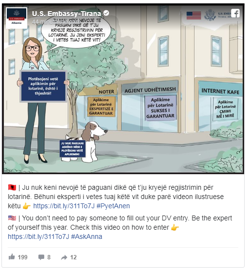 “Ju nuk keni nevojë të paguani dikë që t’ju kryejë regjistrimin për lotarinë. Bëhuni eksperti i vetes tuaj këtë vit duke parë videon ilustruese këtu https://bit.ly/311To7J #PyetAnen“, shkruan faqja zyrtare ambasada në facebook.