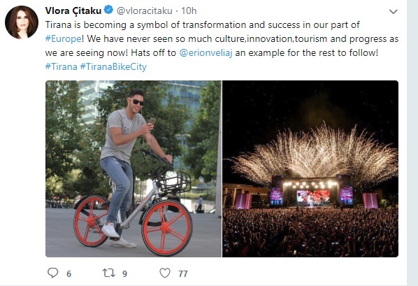 “Tirana po shndërrohet në një simbol të transformimit dhe suksesit në pjesën tonë të #Europe! Ne kurrë nuk kemi parë aq shumë kulturë, inovacion, turizëm dhe progres siç po shohim tani! Heq kapelen për @erionveliaj një shembull për pjesën tjetër për t’u ndjekur! #Tirana #TiranaBikeCity”, shkruan Vlora Çitaku në twitter.