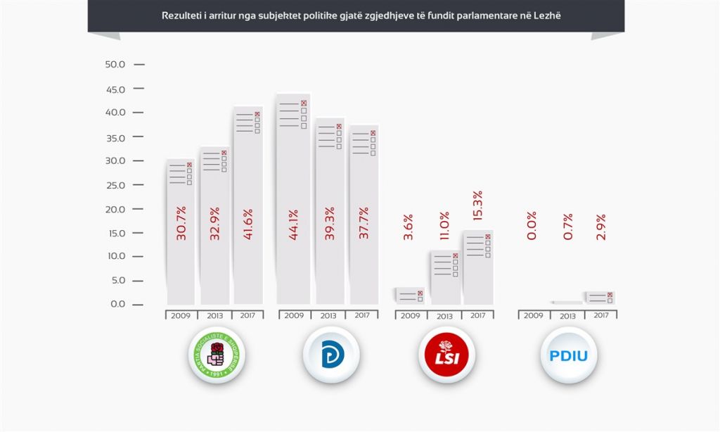 Partia Socialiste arriti të fitojë zgjedhjet në Qarkun Lezhë pasi mori rreth 4 mijë vota më shumë se sa në vitin 2013 ndërsa Partia Demokratike humbi 4 mijë vota në krahasim me katër vjet më parë. LSI arriti të rrisë numrin e saj të votave në Lezhë në 11 mijë, duke siguruar mandatin që më 2013 e pati marrë si pjesë e koalicionit të majtë.