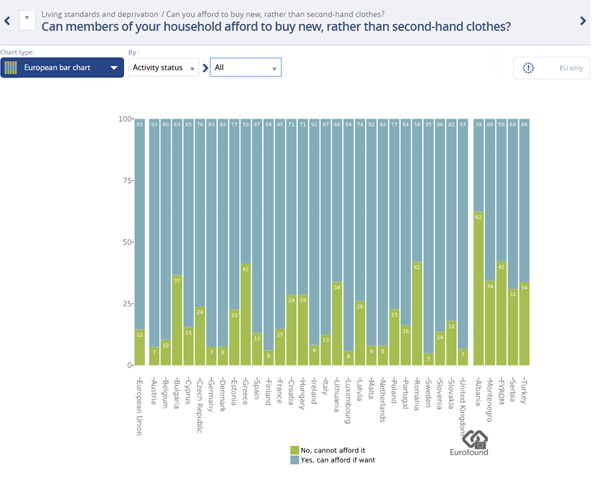 Pyetjes nëse anëtarët e familjes mund të përballojnë të blejnë rroba të reja në vend të të përdorurave, 62% e shqiptareve në Anketën e Cilësisë së Jetës, të realizuar nga Komisioni Europian, janë përgjigjur se nuk munden. Kjo përqindje është dukshëm më e larta në Europë, ku në renditje pas nesh është Maqedonia, me 42% të totalit, ndërsa mesatarja e Bashkimit Europian për të njëjtën pyetje është 15% shkruan Monitor (shih grafikun).