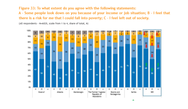 Për gjithë rajonin, raporti thekson se rreth 10% e të anketuarve e përshkruajnë veten si të përjashtuar nga ana sociale ndërsa pothuajse e njëjta përqindje mendon se njerëzit i shohin me inferioritet për shkak të të ardhurave të tyre ose situatës së punës. Pothuajse një e katërta (24%) e popullsisë rajonale ka frikë se mos bjerë në varfëri.