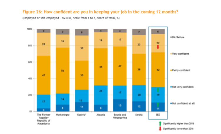 Në të tjera pyetje, 31% e shqiptarëve janë përgjigjur që nuk janëshumë të sigurt nëse do të arrijnë të mbajnë vendin e punës në 12 muajt e ardhshëm, sërish përqindja më e lartë në rajon.