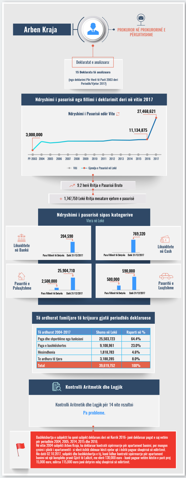 Të dhënat e analizuara nga BIRN tregojnë se prokurori Arben Kraja zotëronte pasuri me vlerë 3 milionë lekë në vitin 2003 – kur deklaroi për herë të parë pasurinë. Referuar deklaratës së vitit 2003, ai kishte një apartament 2+1 të blerë me kredi në vlerën e 2.5 milionë lekëve dhe një automjet tip Benz-Mercedez 190 me vlerë 500 mijë lekë.