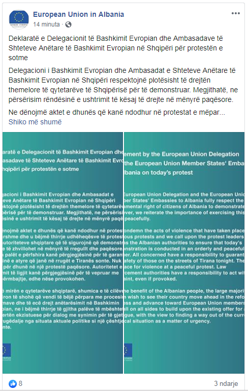 Në deklaratën e ambasadat e BE në Tiranë bëjnë me dije se dënojmë aktet e dhunës që kanë ndodhur në protestat e mëparshme dhe u bëjmë thirrje udhëheqësve të protestës si dhe autoriteteve shqiptare që të sigurojnë që demonstrata e sotme të zhvillohet në mënyrë të rregullt dhe paqësore