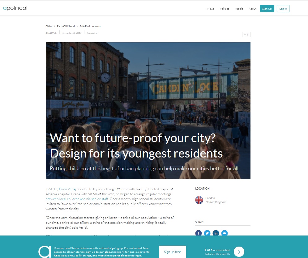 as prestigjiozes britanike “The Guardian”, revista e njohur “Apolitical” i ka kushtuar një artikull të veçantë Tiranës si një qytet model edhe për shumë qytete të tjera në botë për mënyrën se si po projektohet e ardhmja e tij duke vendosur në qendër fëmijët.