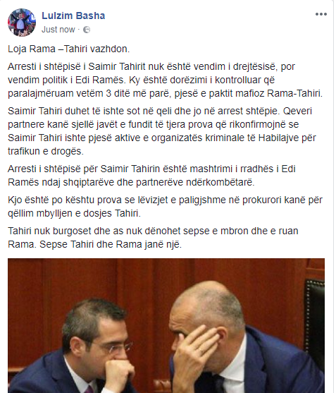 Tahiri nuk burgoset dhe as nuk dënohet sepse e mbron dhe e ruan Rama. Sepse Tahiri dhe Rama janë një”, shkruan Basha.