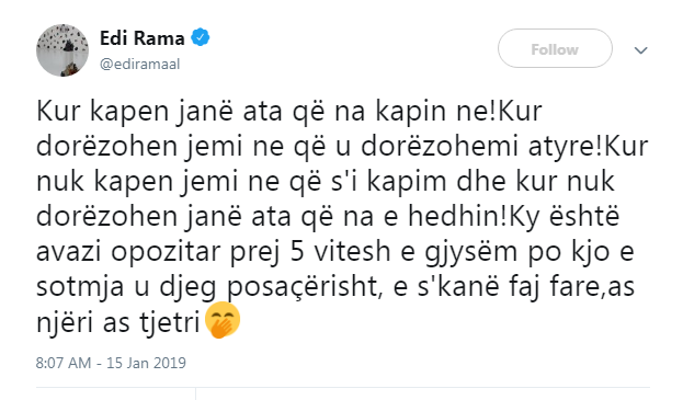 “Kur kapen janë ata që na kapin ne!Kur dorëzohen jemi ne që u dorëzohemi atyre! Kur nuk kapen jemi ne që s’i kapim dhe kur nuk dorëzohen janë ata që na e hedhin! Ky është avazi opozitar prej 5 vitesh e gjysëm po kjo e sotmja u djeg posaçërisht, e s’kanë faj fare,as njëri as tjetri”, shkruan Rama.