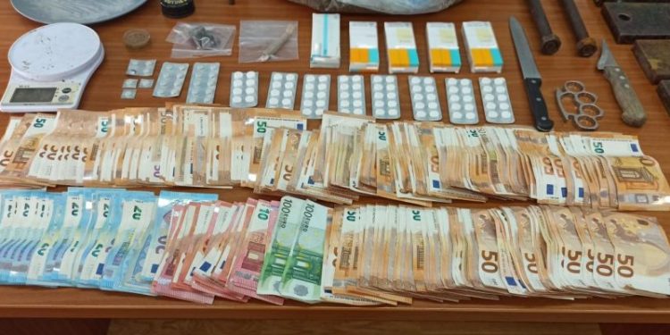 Forcat e rendit pas kontrollit në banesë dy personave, kanë mundur të gjejnë 5 kg kanabis, 23 gram heroinë, si dhe sende të tjera për përpunimin e drogës, peshore elektronike, dy thika, një dorezë hekuri dhe katër telefona celularë.