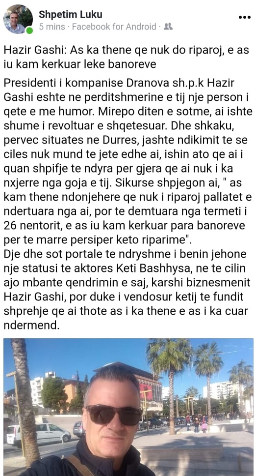 Gazetari Shpëtim Luku ka përcjellë sot qëndrimin e presidentit të kompanisë “Drenova”, mbi lajmet e fundit që kanë qarkulluar sa i takon rehabilimit të ndërtesave të dëmtuara nga tërmeti i 26 nëntorit.