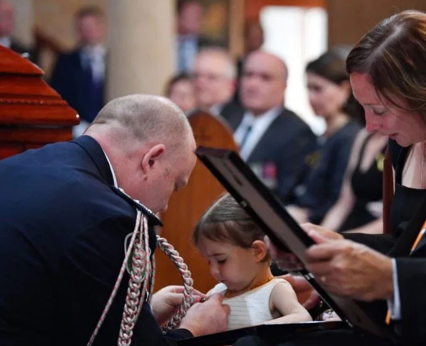 Pamjet, të cilat nuk kanë fjalë për t’u përshkruar, erdhën pak çaste pasi 1-vjeçarja Charlotte O’Dwyer pranoi medaljen e shërbimit, që iu dha pas vdekjes babait të saj, Andrew O’Dwyer, nga Shërbimi Rural i Zjarrfikëses të martën.