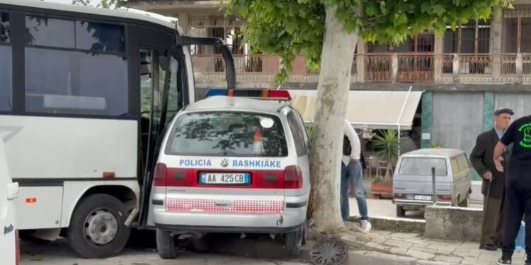 Një automjet i policisë bashkiake është përplasur me një autobus të linjës Libofshë- Fier, mëngjesin e sotëm në vendin e quajtur “ Ura e Sheqit” në Fier.
