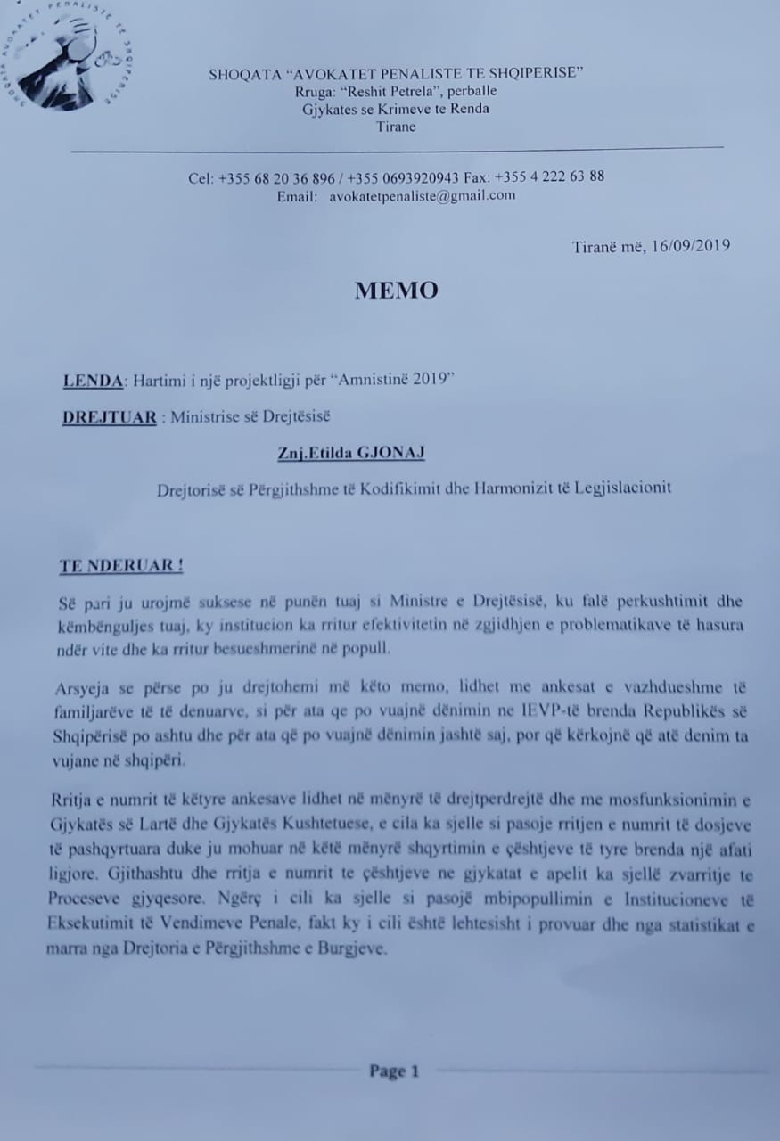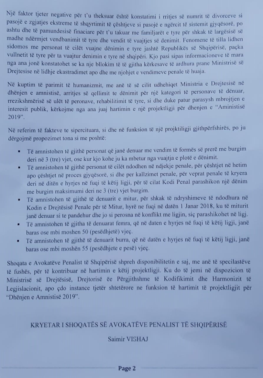 Kryetari i shoqatës së avokatëve penalistë të Shqipërisë Saimir Vishaj i ka dërguar një memo ministres së Drejtësisë Etilda Gjonaj ku i kërkon hartimin e një projektligji që të përfshijë një amnisti të gjerë për të burgosurit të cilët për shkak të mosfunksionimit të Gjykatës së Lartë dhe Kushtetuese po u zgjatet koha e qëndrimit në burg duke sjellë madje dhe probleme familjare si divorci.