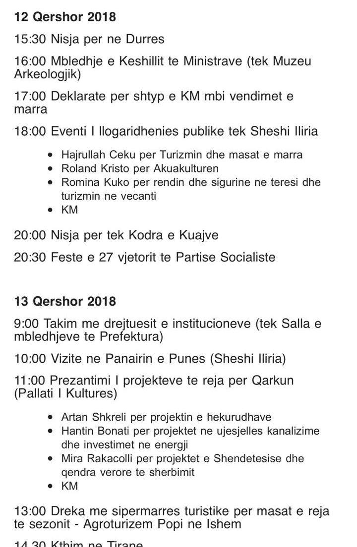 Qeveria ‘Rama 2’ do të zhvendoset në qytetin bregdetar të Durrësit në mbledhjen e radhës dyditore. Mbledhja do të nisë pasditen e sotme në orën 16:00, ndërsa më pas do të ketë një deklaratë nga Rama në lidhje me vendimet që janë marrë. Pasdite do të ketë një takim me qytetarët në kuadër të ‘Llogaridhënies’, ndërsa në mbrëmje do të festohet 27-vjetori i themelimit të Partisë Socialiste.