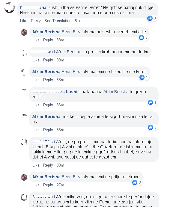 Ndërkohë, përmes disa komenteve të bëra në profilin e tij të Facebook-ut, babai i Alvnit, Afrim Berisha thekson se ende janë në negociata me forcat kurde për ta nxjerrë djalin nga zona e kontrolluar prej tyre.