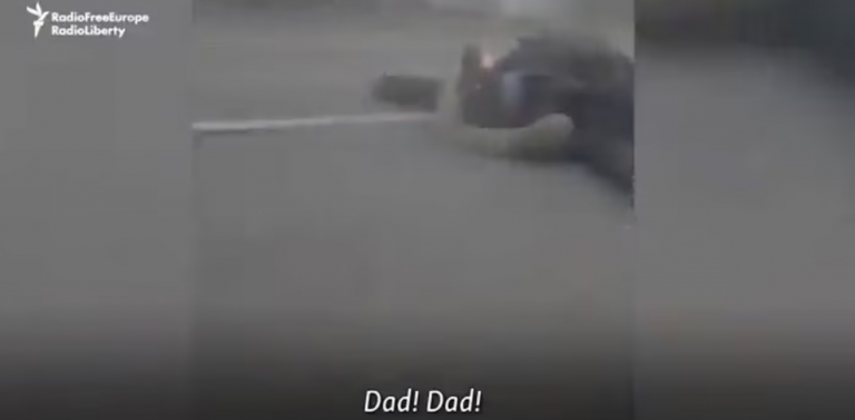 Pasi ndalojnë dhe teksa ai i kërkon të atit të kthehet mbrapa, dhe me ushtrinë në një distancë të konsiderueshme, plumbat përplasen në automjet. “Dil dhe shtrihu”, i bërtet ai babait të tij, i quajtur nga media si Oleh Bulavenko. ‘Mund të më dëgjosh? Kthehuni dhe dil në të djathtë.’