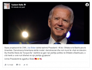 Kryetari i Grupit Parlamentar të Partisë Socialiste, Taulant Balla, ka reaguar pas publikimit të projeksionit të CNN, i cili shpall se Joe Biden është tashmë Presidenti i 46-të i Shteteve të Bashkuara të Amerikës.