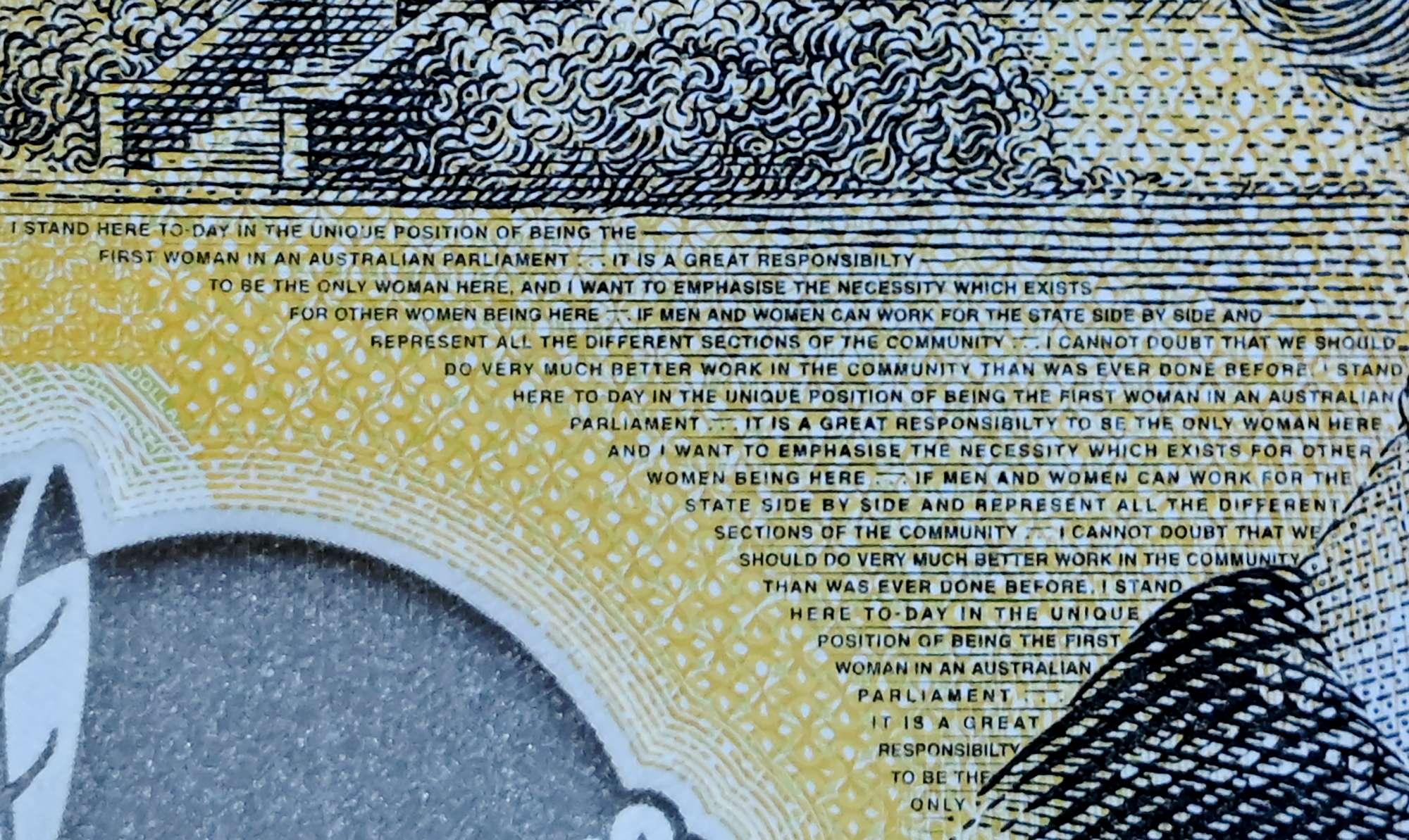 Teksti në fjalë gjendet në sfondin e portretit të Edith Cowan, gruaja e parë e zgjedhur në Parlamentin australian dhe në të shihet një pjesë prej fjalimit të saj të parë.