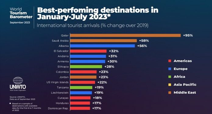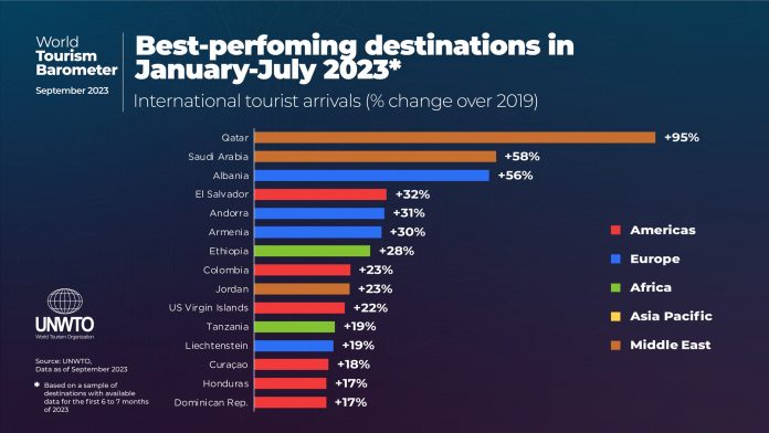 Sipas nënrajoneve, Afrika e Veriut (+8%), Amerika Qendrore (+2%) dhe Evropa Mesdhetare Jugore (+1%) tejkaluan nivelet para pandemisë në janar-korrik 2023.