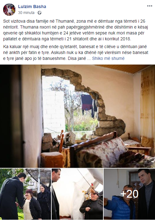 Sot vizitova disa familje në Thumanë, zona më e dëmtuar nga tërmeti i 26 nëntorit. Thumana nxorri në pah papërgjegjshmërinë dhe dështimin e kësaj qeverie që shkaktoi humbjen e 24 jetëve vetëm sepse nuk mori masa për pallatet e dëmtuara nga tërmeti i 21 shtatorit dhe ai i korrikut 2018.